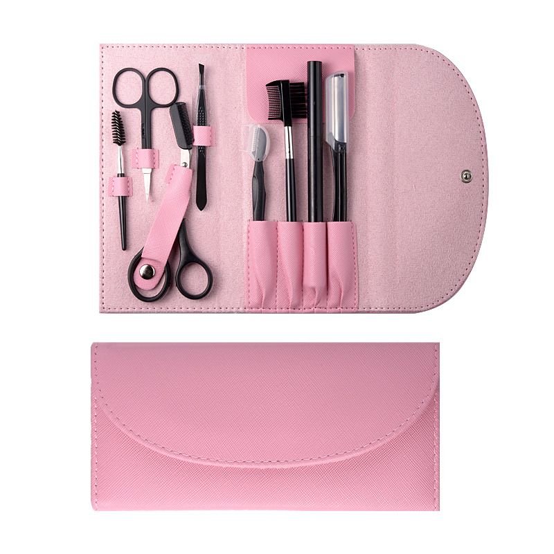 This is a stainless steel eyebrow set beauty makeup tool set of nine.Specifications: This product has two different styles, one and two respectively, each style is black, pink and khaki three colors;Material: stainless steel, PU leatherOthers: Packing is PU leather or PVC bag, the size is about 16.5*7.5cm;Note: The shipment quantity of this product is 3 pieces, less than 3 pieces will not be shipped.